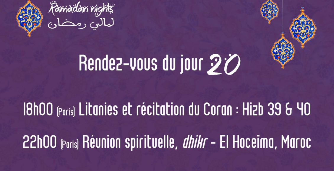 ليالي رمضان الموعد اليومي #20 الأحد 02 ماي 2021 على الساعة الرابعة مساء بتوقيت المغرب Nous vous convions à participer à la récitation du wird de la tariqa Alawiyya-Darqawiyya-Shadiliyya puis à la lecture du Coran selon une psalmodie typique de l’ouest algérien (mode chergui). Chaque jour deux chapitres (hizb) seront récités. Ces psalmodies se font … تابع قراءة ليالي رمضان الموعد اليومي #20 الأحد 02 ماي 2021 على الساعة الرابعة مساء بتوقيت المغرب