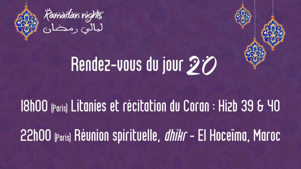Powered by Restream https://restream.io/Pour notre vingtième soirée bénie de ce mois de Ramadan 2021, nous sommes accueillis par nos sœurs et frères les disciples de la voie soufie Alawiyya d’El Hoceima du Maroc.