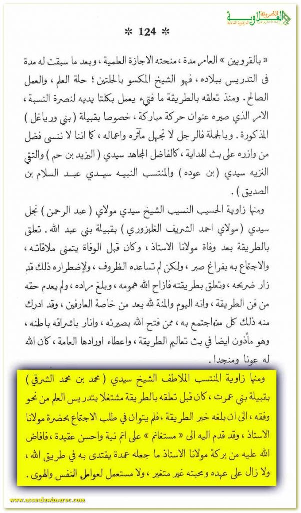 A signaler que le défunt a été le moqadem de la tariqa à la région de Jbel hamam au Rif depuis la période du Cheikh Sidi Ahmed al-Alawi et qu’il est resté fidèle jusqu’au Cheikh Sidi Khaled Bentounes