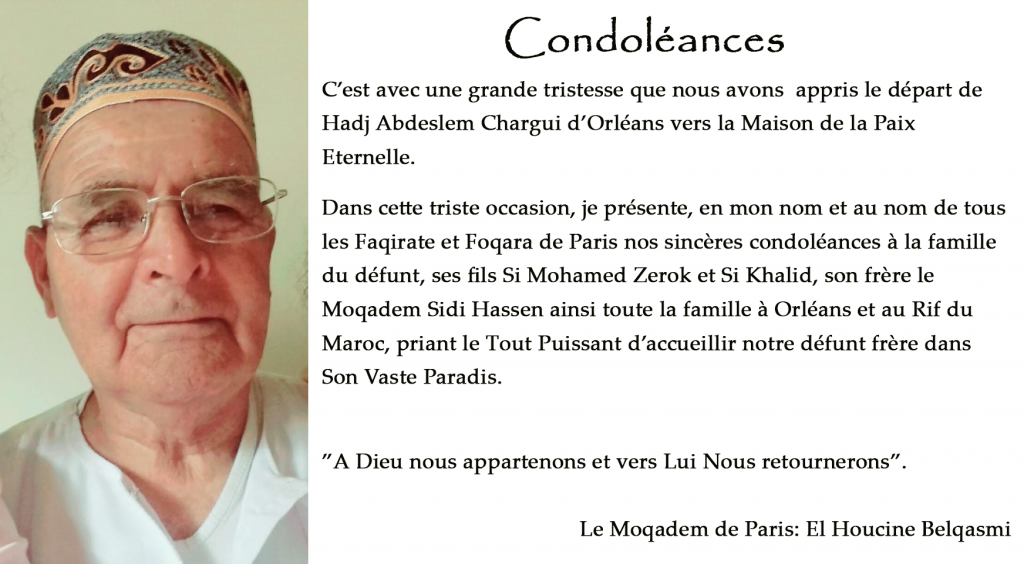 إننا بهذه المناسبة الأليمة يتقدم نائب الشيخ سيدي خالد بن تونس الحاج حسن اليسيني. أصالة عن نفسه ونيابة عن مريدي ومريدات الطريقة العلاوية بالمملكة المغربية الشريفة وكافة أعضاء موقع جمعية الشيخ العلاوي بأحر تعازيهم وأخلص مواساتهم لشيخنا سيدي خالد بن تونس ولعائة الفقيد وأحبائه، رافعين أكف الضراعة بأن يتغمده الله برحمته الواسعة ويتجلى عليه بكرم عفوه وحلمه،