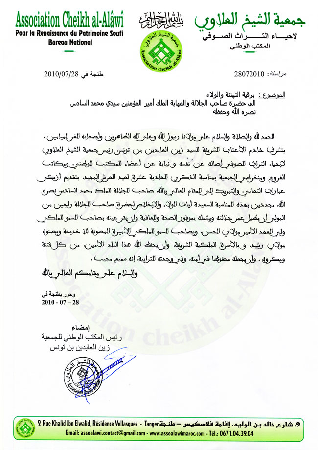 أنشطة الجمعية برقية التهنئة والولاء الى حضرة صاحب الجلالة والمهابة الملك أمير المؤمنين سيدي محمد السادس نصره الله وحفظه بواسطة admin اخر تحديث يوليو 28, 2017 3٬774 مشاركة 3٬774 مشاركة