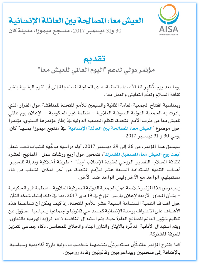 في إطار المؤتمر السنوي، الذي تنظمه الجمعية الدولية الصوفية العلاوية، المنظمة غير الحكومية، عيسى، أعطي الموعد هذه المرة، بمنتجع ميموزا روسور، بمدينة كان الفرنسية، الذي شهد مجريات ندوة دولية، يومي 30 و31 ديسمبر 2017، عنوانها “العيش معا و مصالحة العائلة البشرية”.