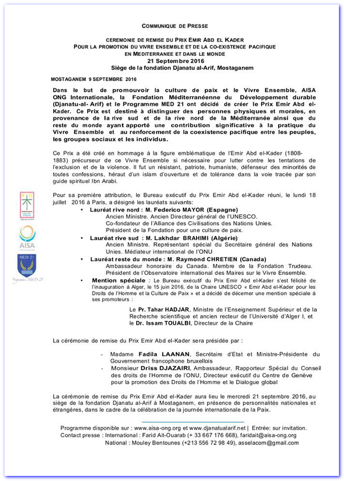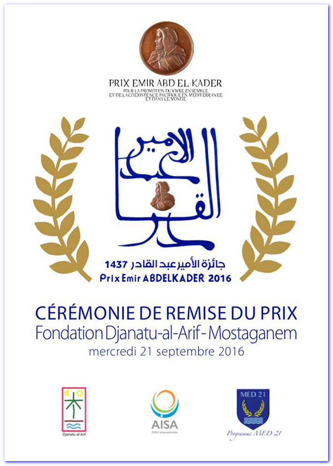 تتشرف المؤسسة المتوسطية للتنمية المستدامة “جنة العارف” و على رأسها الدكتور الشيخ خالد بن تونس الرئيس الشرفي لـ “جنة العارف” بدعوة الجميع، كبارا و صغارا، رجالا و نساءا، أعضاء و غير أعضاء إلى حفل تسليم ” جائزة الأمير عبد القادر لتطويع العيش معا والتعايش السلمي في العالم “ يوم الأربعاء 2016/09/21 بمقر مؤسسة “جنة العارف” بمستغانم و التي ستمنح إلى كل من