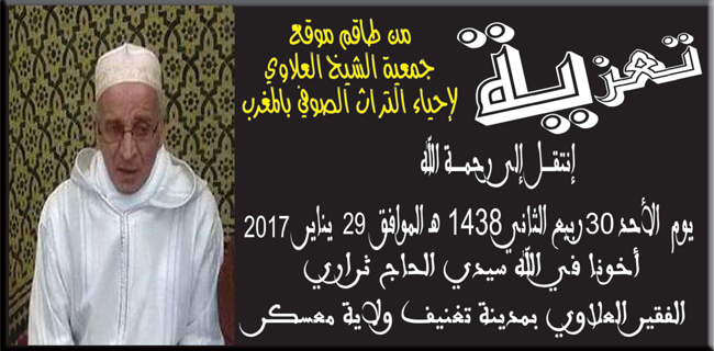 تحية المحبة والسلام، إحتضنت الزاوية العلاوية ببرج بوعريريج عصر يوم الجمعة 24/03/2017 جمع ذِكر وترحم على أرواح من إنتقلـــوا إلى رحمة الله تعالى منهم خاصة والد أخينا سي عبد الكريم ومقدم زاوية وهران سيدي الحاج حموش ومقدم زاوية تغنيف ولاية معسكر سيدي الحاج طراري وسيدي منصور من بني ورثيلان ولاية سطيف وهو فقير من زمن الشيخ العلاوي قدس الله سره وللة يايا خادمة النسبة العلاوية من مستغانم، وعرف الجمع حضور عدد كبير من المريدين من برج بوعريريج وسطيف وبجاية وزمورة وتسامرت وجعافرة والقلة وفقير من وهران وفقير من باريس (فرنسا)، فرحم الله جميع أموات المسلمين