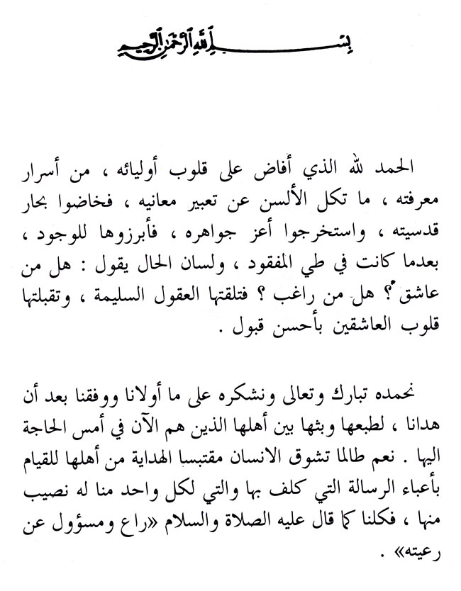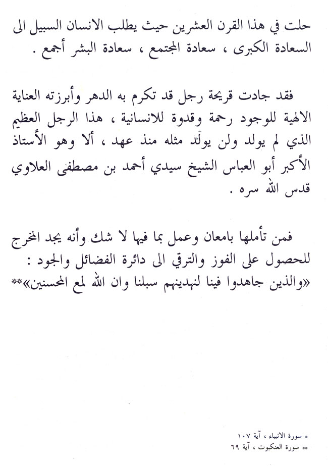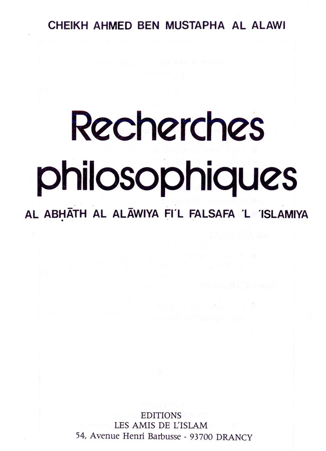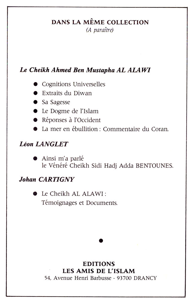 طبعته جمعية أحباب الإسلام، بباريس باللغتين العربية والفرنسية (1984) وهو مجموعة أبحاث جادت بها قريحة الأستاذ في أوقات مختلفة، ليأخذ منها المريد بقدر الاستعداد وهي خلاصة آرائه في حقيقة الإنسان، ووظيفته في المجتمع الذي يعيش فيه