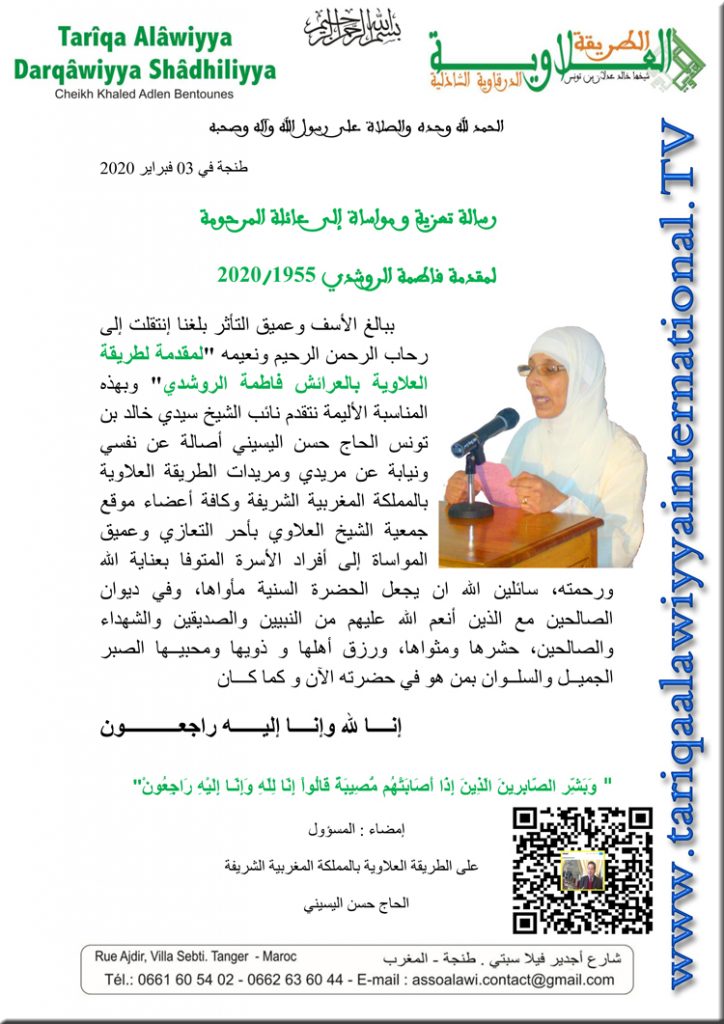 التعــازي توفيت صباح هذا اليوم لمقدمة فاطمة الروشدي بمدينة العرائش 03 فبراير 2020 بواسطة ASSO ALAWI اخر تحديث فبراير 6, 2020 1٬296 مشاركة 1٬296 مشاركة