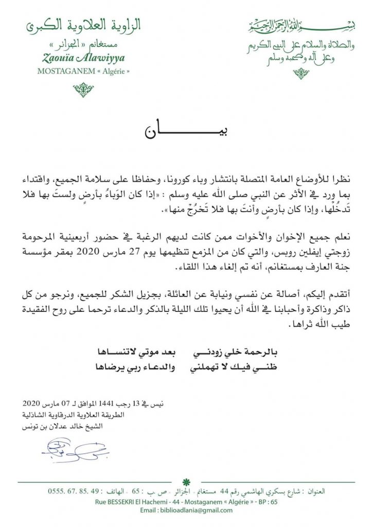 أنشطة شيخ الطريقة العلاوية بيان من الشيخ خالد بن تونس من مدينة نيس فرنسا بواسطة ASSO ALAWI اخر تحديث مارس 27, 2020 1٬209 مشاركة 1٬209 مشاركة