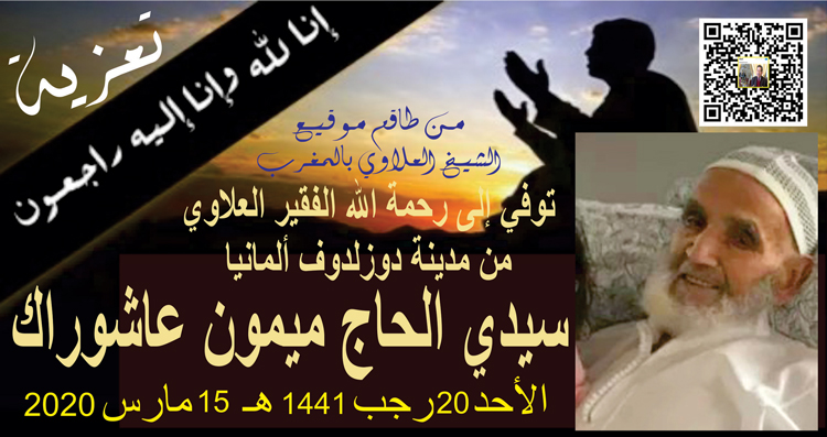 ببالغ الأسى والحزن وبقلوب مؤمنة بقضاء الله وقدره، تلقينا خبر بوفــاة سيدي الحاج ميمون عاشوراك، الفقير العلاوي، من مدينة دوزلدوف المانيا “ وبهذا المصاب الجلـــل نتقـدم طاقم الموقع الشيخ العلاوي بتعــازينـا القلبية الحارة، وبمشاعر المواساة والتعاطف الأخوية، سائليـن الله تعالى أن يتغمـد الفقيــد العزيـز بواسع رحمته ويسكـنـه فسيح جنـــاته، وينعــــم عليه بعفوه ورضوانـــه