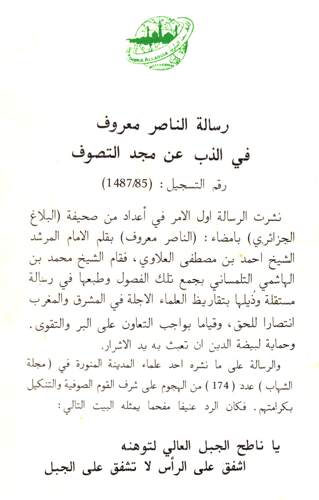 كتب الشيخ العلاوي رسالة الناصر معروف في الذب عن مجد التصوف بواسطة admin اخر تحديث 2٬552 مشاركة 2٬552 مشاركة