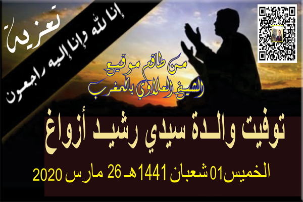 تلقينا ببالغ الأسف وعميق التأثر نبأ فقدان أختنا في الله المنتقلة إلى عفو الله و رحمته ” المرحومة والدة سيدي رشيد “ من مدينة الحسيمة و إننا بهذا النبإ الجلل نتقدم نحن طاقم موقع الشيخ العلاوي من مدينة طنجة بأحر تعازينا وأخلص مواساتنا لعائلة الفقيدة وأحبابها، رافعين أكف الضراعة بأن يتغمدها الله برحمته الواسعة ويتجلى عليها بكرم عفوه وحلمه، ويلحقنا بهـــا على تمــام الإسـلام و الإيمــان و الإحســان