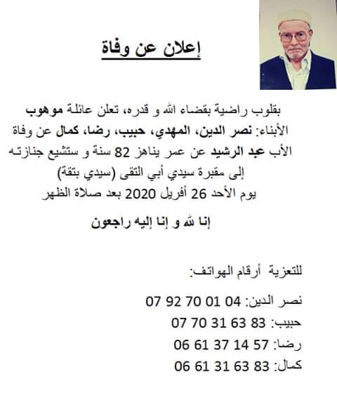 إنتقل إلى رحمة الله سيدي الحاج عبد الرشيد موهوب اليوم الأحد 26 أبريل 2020