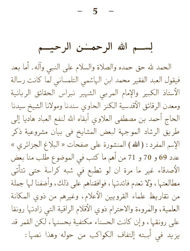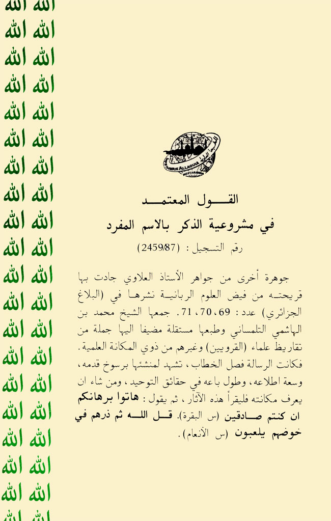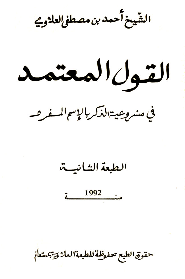 كتب الشيخ العلاوي الله القول المعتمد في مشروعية الذكر بالإسم المفرد بواسطة admin اخر تحديث 6٬668 مشاركة 6٬668 مشاركة