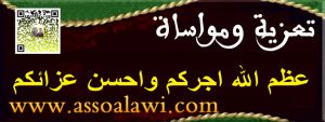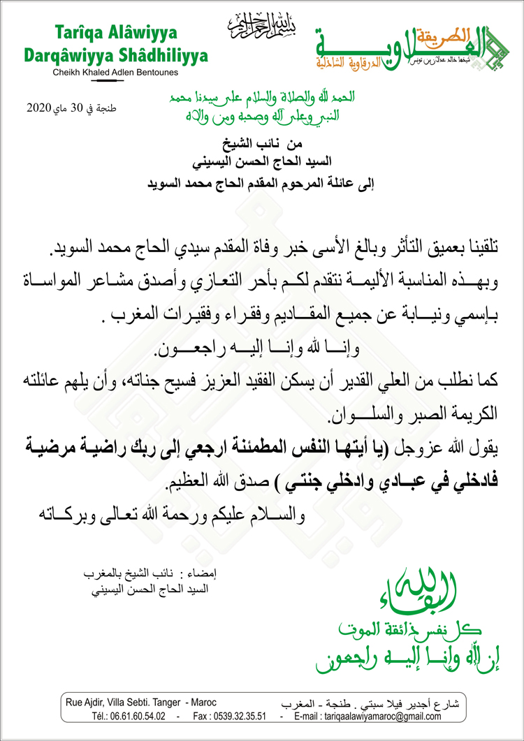 بسم الله الرحمان الرحيم، باسمي واسم فقراء وفقيرات. مدريد أتقدم بأحر التعازي الخالصة إلى عائلة الفقيد سيدي الحاج محمد السويد وإلى كل الفقراء أهل النسبة وخاصة فقراء وفقيرات مدينة تاوريرت. طالبينا الله أن يشمله برحمته الواسعة ويلحقه بنبينا عليه السلام، وانا لله وانا اليه راجعون. اللهم أجرنا في مصيبتنا واخلفنا خيرا منه سيدي العبدلاوي الحاج أمحمد من مدريد