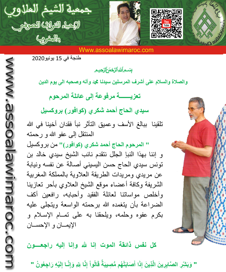 تعزية ومواسات مرفوعة إلى أسرة المرحوم سيدي الحاج أحمد شكري وإلى إخوانه في الله فقراء الطريقة العلاوية الدرقاوية الشاذلية ببلجيك ًمن مريدي الزاوية العلاوية بالحسيمة ً نشاطركم الاحزان، وللفقيد الرحمة والغفران، ولكم من بعده طول البقاء ،إنا لله وإنا إليه راجعون