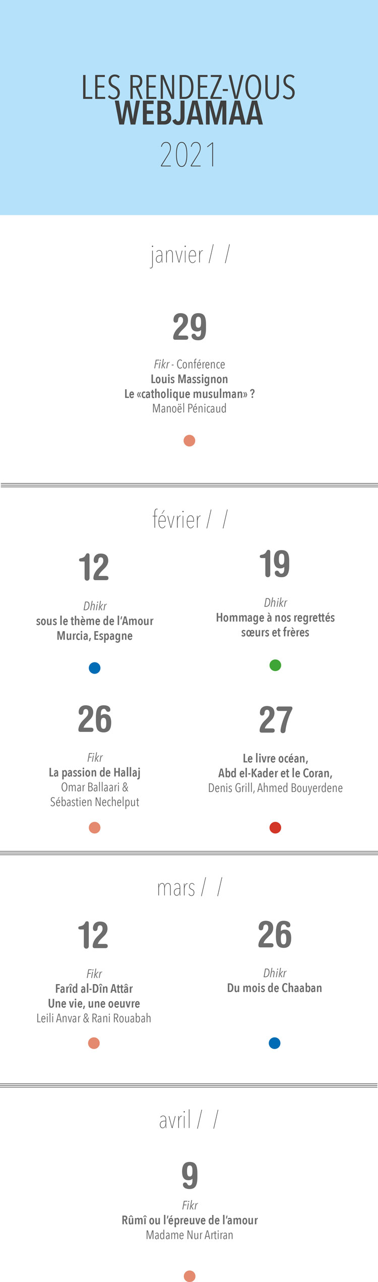 Veuillez trouvez ci-joint le calendrier des soirées de dhikr et de fikr programmées jusque début avril 2021.