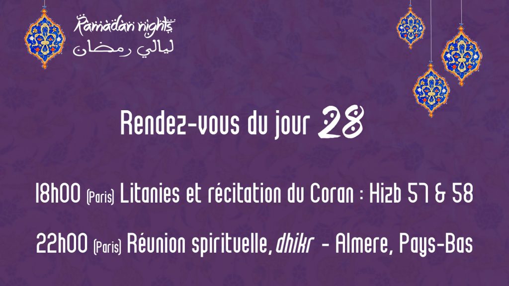 Powered by Restream https://restream.io/ Pour notre 28ème soirée bénie de ce mois de Ramadan 2021, nous sommes invités par les disciples de la voie soufie Alawiyya de la ville d’Almere aux Pays-Bas.