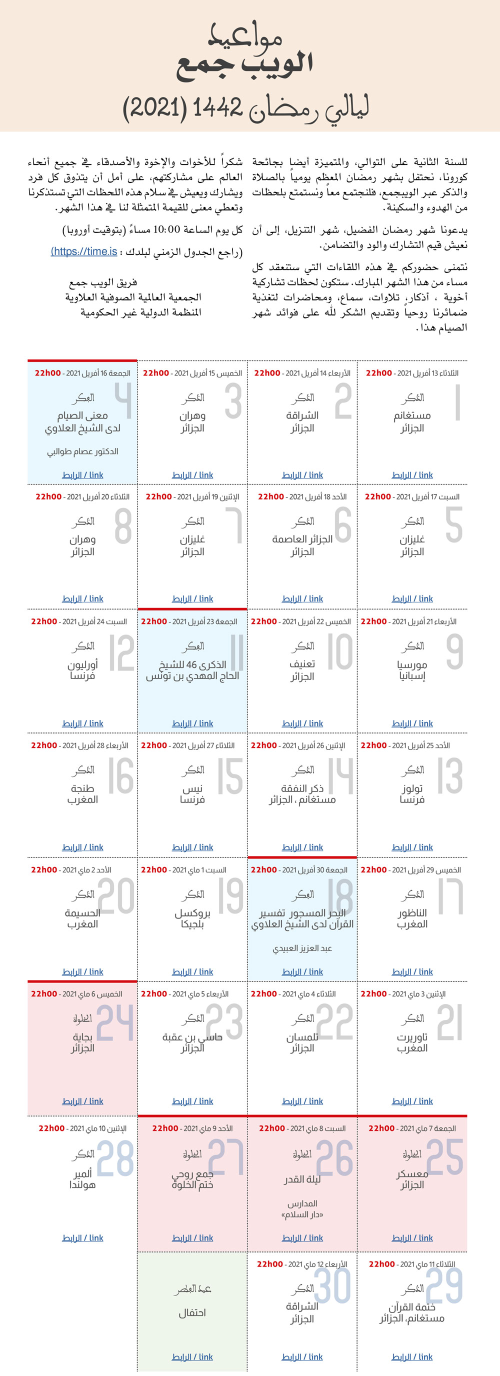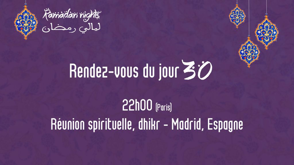 ليالي رمضان الموعد اليومي #30 – الأربعاء 12 ماي 2021 على الساعة 22h00 بتوقيت باريس بواسطة ASSO ALAWI اخر تحديث مايو 12, 2021 1٬083 مشاركة ليالي رمضان الموعد اليومي #30 الأربعاء 12 ماي 2021 على الساعة 22h00 بتوقيت باريس – الذكر : مدريد إسبنيا Rendez-vous du jour #30 Ramadan Nights : Réunion spirituelle Madrid, Espagne 22h00 (Paris) sur Zoom Lien Calendrier / Calendar Ramadan Nights الموعد اليومي #30 ليالي رمضان 22h00 (Paris) sur Zoom Lien يومية ليالي رمضان ليالي رمضان الموعد اليومي #30 الأربعاء 12 ماي 2021 – الذكر : مدريد إسبنيا 1٬083 مشاركة