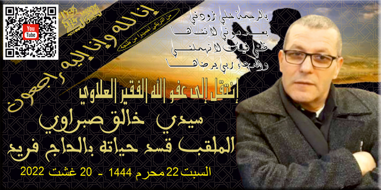 ببالغ الحزن والأسى نبأ وفاة الفقير الى الله سيدي خالق صبراوي الملقب بالحاج فريد إننا بهذه المناسبة الأليمة يتقدم نائب الشيخ سيدي خالد بن تونس الحاج حسن اليسيني. أصالة عن نفسه ونيابة عن مريدي ومريدات الطريقة العلاوية بالمملكة المغربية الشريفة وكافة أعضاء موقع جمعية الشيخ العلاوي بأحر تعازيهم وأخلص مواساتهم لشيخنا سيدي خالد بن تونس ولعائة الفقيد وأحبائه، رافعين أكف الضراعة بأن يتغمده الله برحمته الواسعة ويتجلى عليه بكرم عفوه وحلمه،