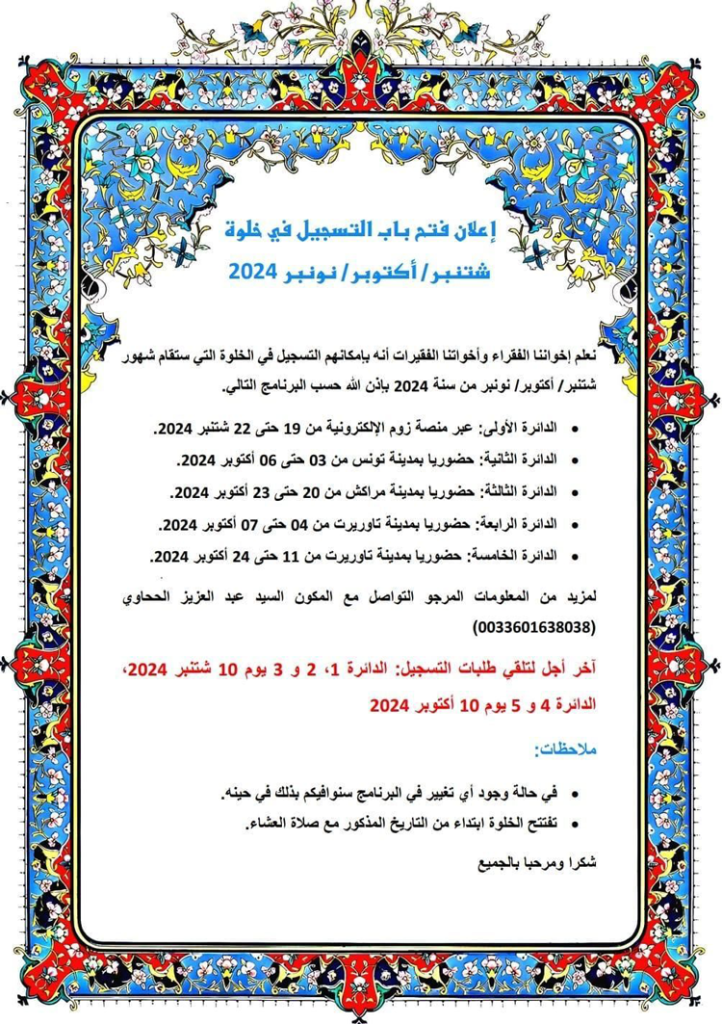 أنشطة شيخ الطريقة العلاوية إعلان فتح باب التسجيل في خلوة شتنبر – أكتوبر – نونبر 2024 بواسطة admin اخر تحديث ديسمبر 11, 2024 757 مشاركة 757 مشاركة