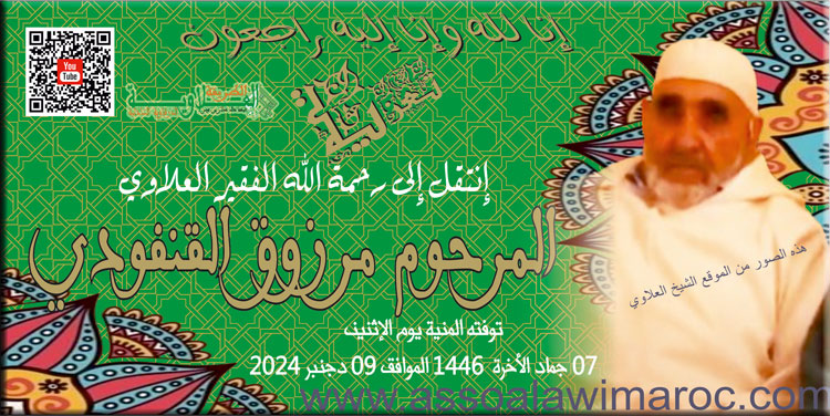 تعازينا القلبية الحارة للعائلة المرحوم، ولجميع الفقراء والفقيرات، بدون أن ننسى شيخنا الفاضل سيدي خالد بن تونس اطال الله في عمره وابقـــاه ذخـرا لطريقة الشاذلية الدرقاوية العلاوية