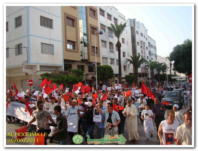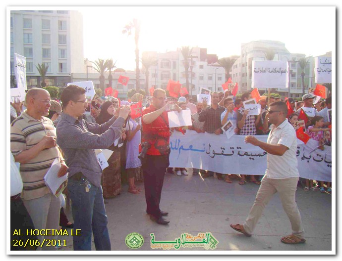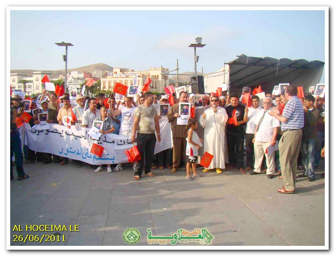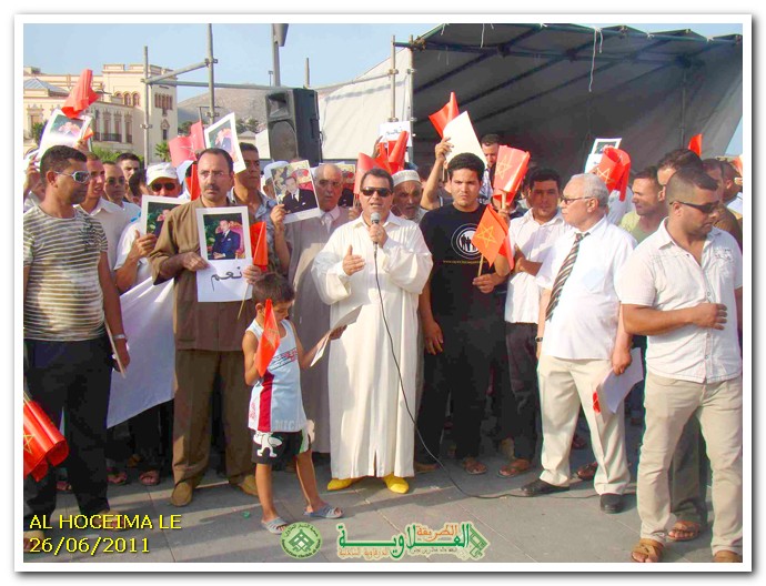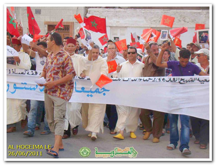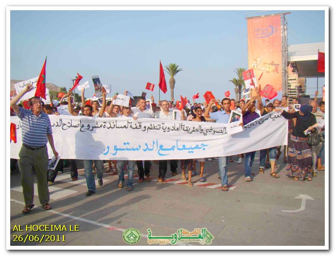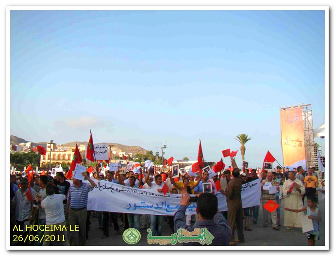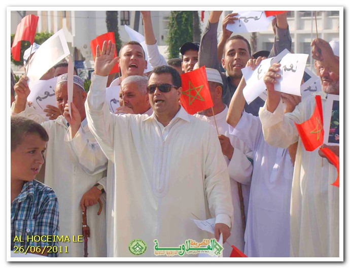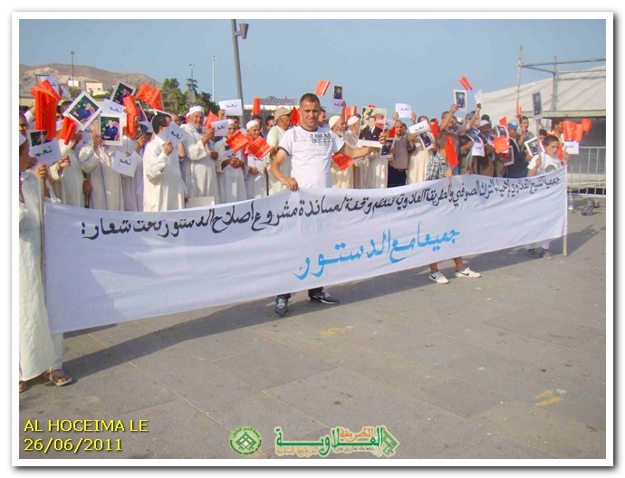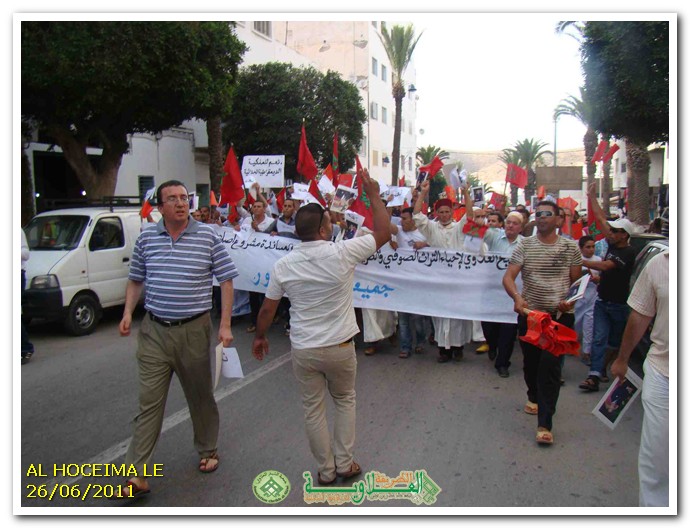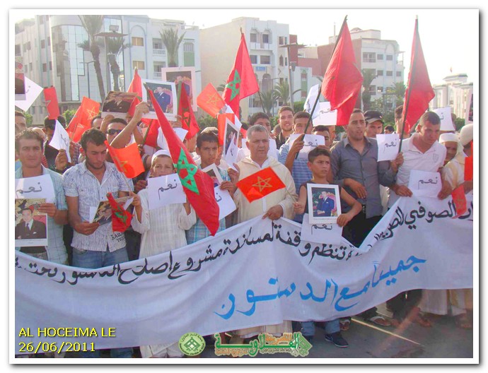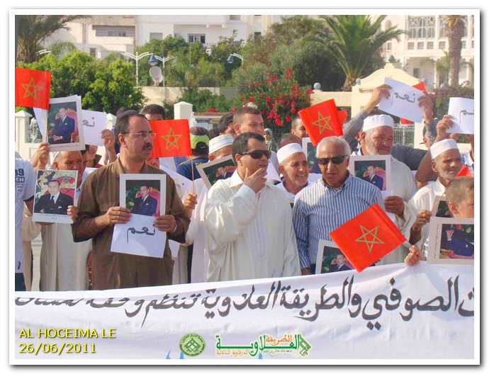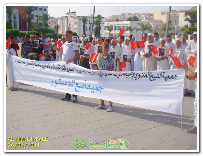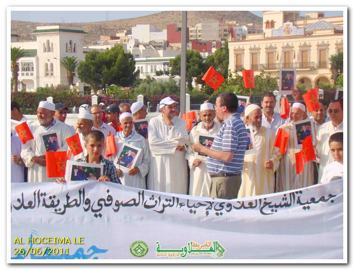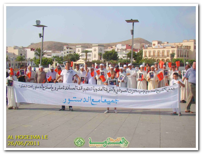 جمعية الشيخ العلاوي لإحياء التراث الصوفي ومريدي الطريقة العلاوية بالحسيمة نظموا وقفة بساحة محمد السادس مع العديد من فعاليات المجتمع المدني لتأييد الدستور، وقد القى خطاب جماهري بالنيابة عن المريدين وأعضاء الجمعية مقدم الزاوية بالحسيمة السيد محمد غمبو بالعربية والامازيغية …. ثم إنطلقت المسيرة حيث جابت اهم شوارع المدينة لتستقر وتختم الوقفة بنفس مكان الانطلاقة