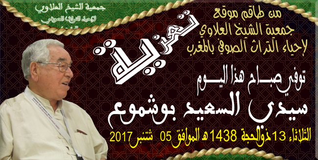 فيديوالتعــازي توفي صباح هذا اليوم اخينا في الله الحاج السعيد بوشموع بواسطة ASSO ALAWI اخر تحديث سبتمبر 12, 2017 2٬225 مشاركة المرحوم سي سعيد بوشموع 2٬225 مشاركة