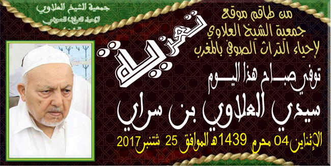 وُرِيَ الثرى اليوم بمدينة غليزان بالجزائر جثمان الفقير الذاكر الصادق الانتساب إلى الطريقة العلاوية الدرقاوية الشاذلية، سيدي الحاج الحبيب العلاوي بن سراي، إننا بهذه المناسبة الأليمة نتقدم بأحر التعازي وخالص المواساة إلى عائلة الفقيد خصوصا أولاده سي نور الدين سي جمال و سيد علي و إلى أخيه سي احمد بن سراي بمدينة وهران وكافة أسرته من ابناء وأحفاد و حفيدات ، وإلى كل مريدي الطريقة العلاوية بمدينة غليزان رجيا ان يلهم الجميع جميل الصبر و السلوان على فقدانه وأن يكرم الله نزل الراحل ويوسع مدخله ويسكنه فسيح جناته مع النبئيين والصديقين والشهداء والصالحين وحسن أولائك رفيقا.