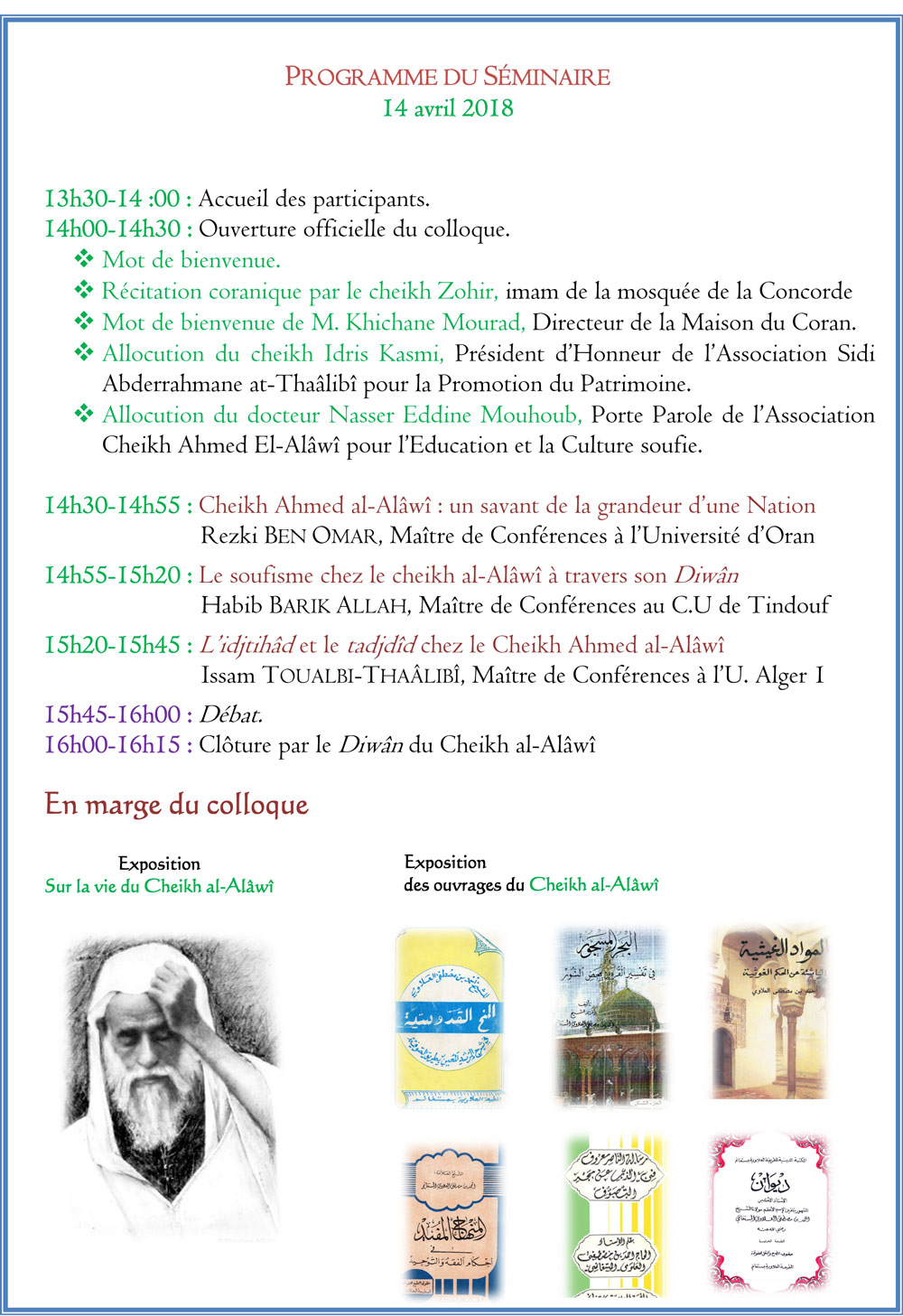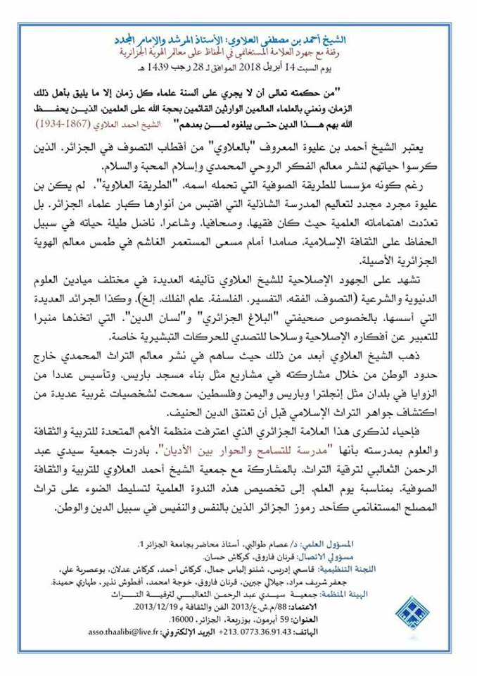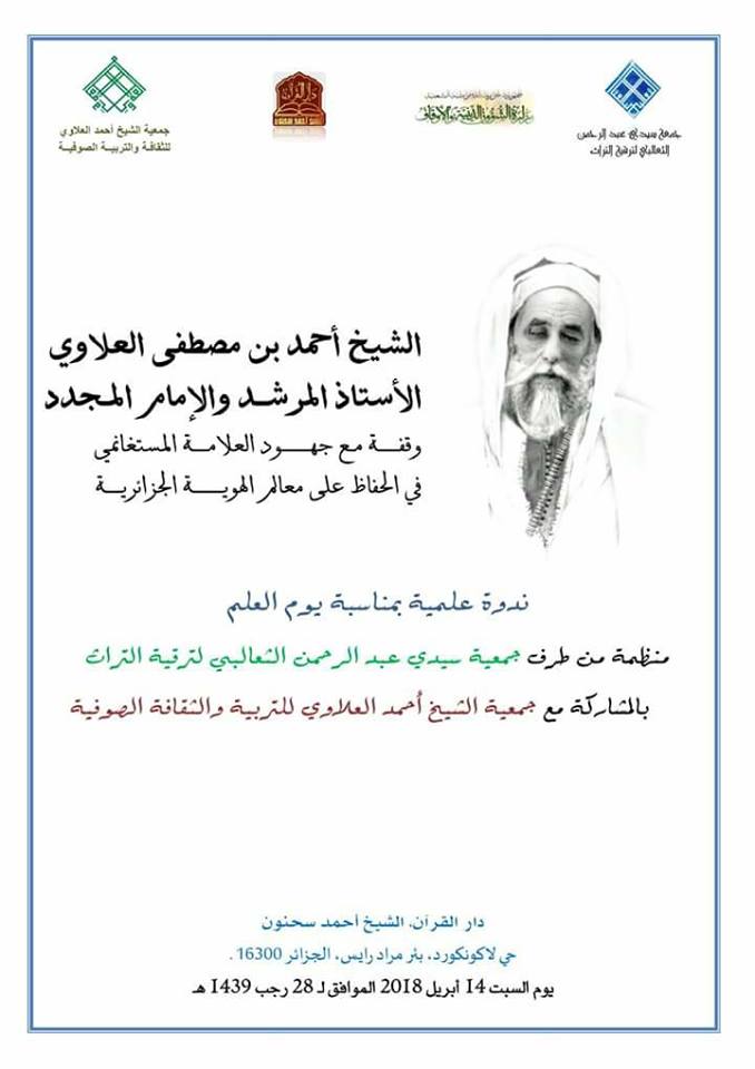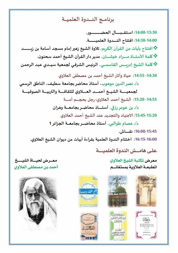 جمعية الشيخ العلاوي الشيخ أحمد بن مصطفى العلاوي الستاذ المرشد والإمام المجدد – برنامج الندوة العلمية بواسطة ASSO ALAWI اخر تحديث أبريل 13, 2018 2٬082 مشاركة 2٬082 مشاركة