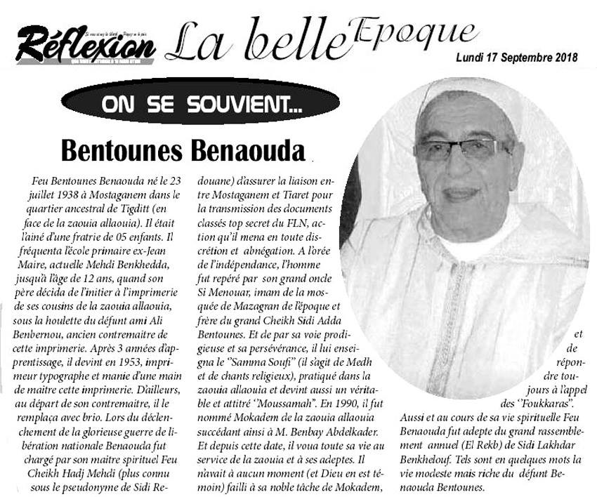 Bonjour : Nous vous informons que le quarantième jour du Mokadem de la zaouia Alawiyya Mère de Mostaganem Hadj Benaouda Bentounes, sera célébré le vendredi 14/09/2018 après la prière de ‘Asr
