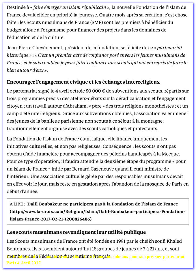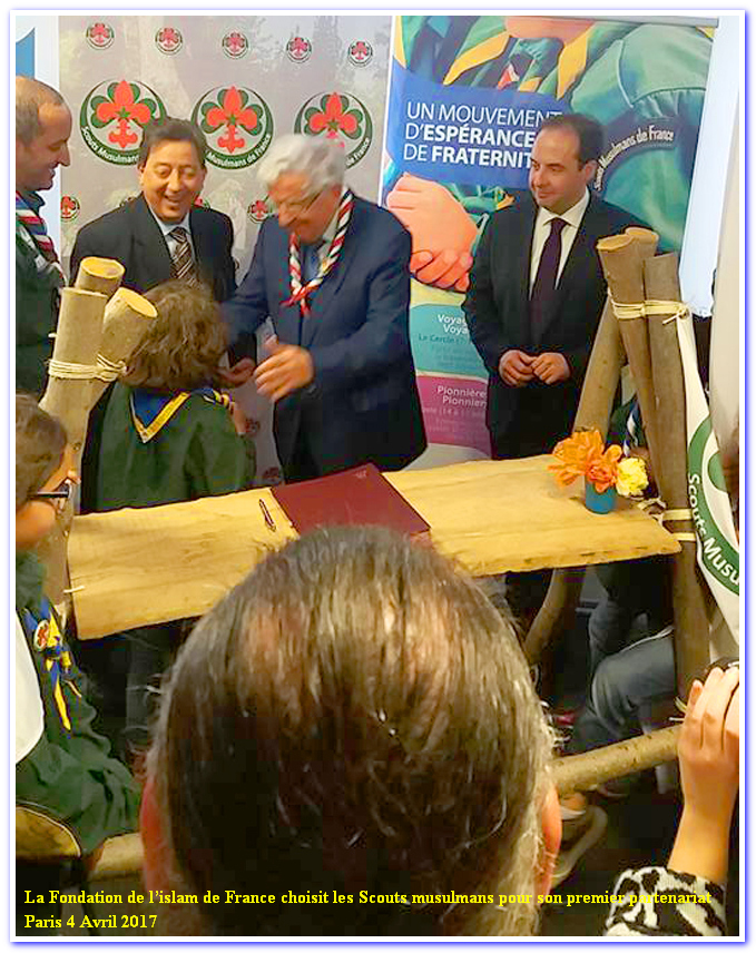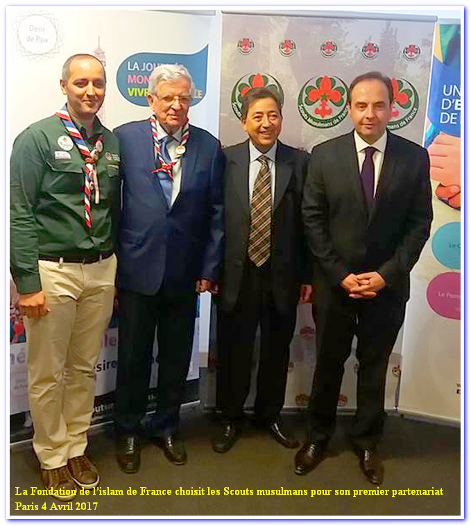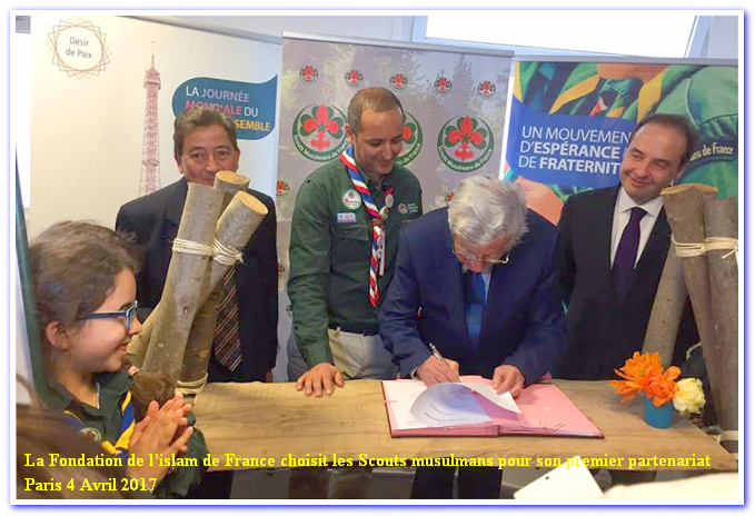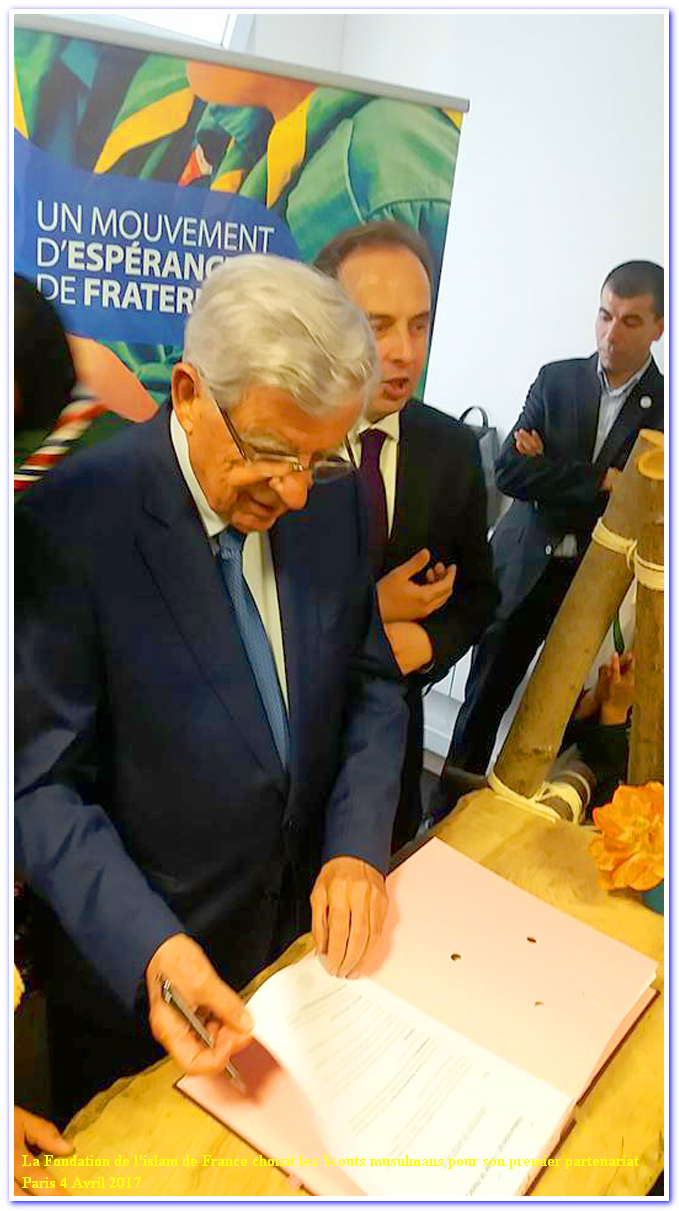 La Fondation de l’Islam de France, représentée par son président M. Jean-Pierre Chevènement, et l’association des Scouts Musulmans de France, représentée par son président M. Abdelhak Sahli, se sont réunis mardi 4 avril à 17h00 à Drancy pour la signature de trois conventions qui marqueront le lancement de projets à travers le partenariat des deux parties.