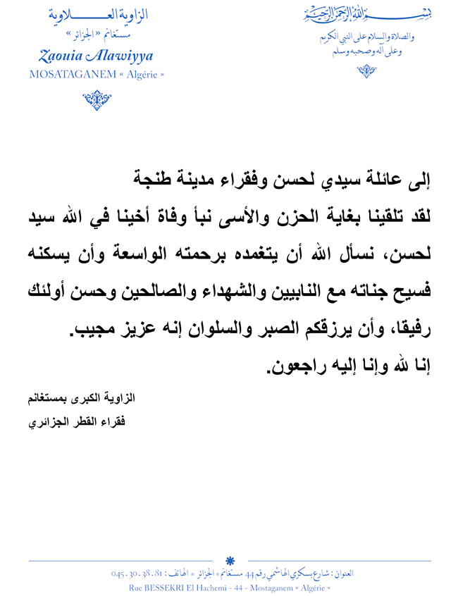 تلقينا ببالغ الاسف نبأ وفاة أخينا في الله المريد العلاوي من مدينة طنجة سيدي لحسن باجلول اليوم بأحد مصحات الرباط بعد مرض مفاجئ ، و إنني بهذه المناسبة الأليمة أصالة عن نفسي و نيابة عن كل مريدي و مريدات الطريقة العلاوية ببلجيكا على رأسهم مقدم و أعيان الطريقة بأحر التعازي و أصدق المواساة إلى أبناء و بنات وزوجة الفقيد و مريدي الطريقة العلاوية بمدينة طنجة ، سائلين الله تعالى أن يتغمده برحمته و يوسع مدخله و يكرم نزله و يتقبله عنده في عباده الصالحين ، ويجعله في زمرة من أنعم عليهم من النبيئين و الصديقين و الشهداء و الصالحين و حسن أولائك رفيقا ، و نحن معه اجمعين و يلحقنا به و بمن سبق من عباده الذاكرين على أحسن حال و خير مآل و الحمد لله على كل حال .