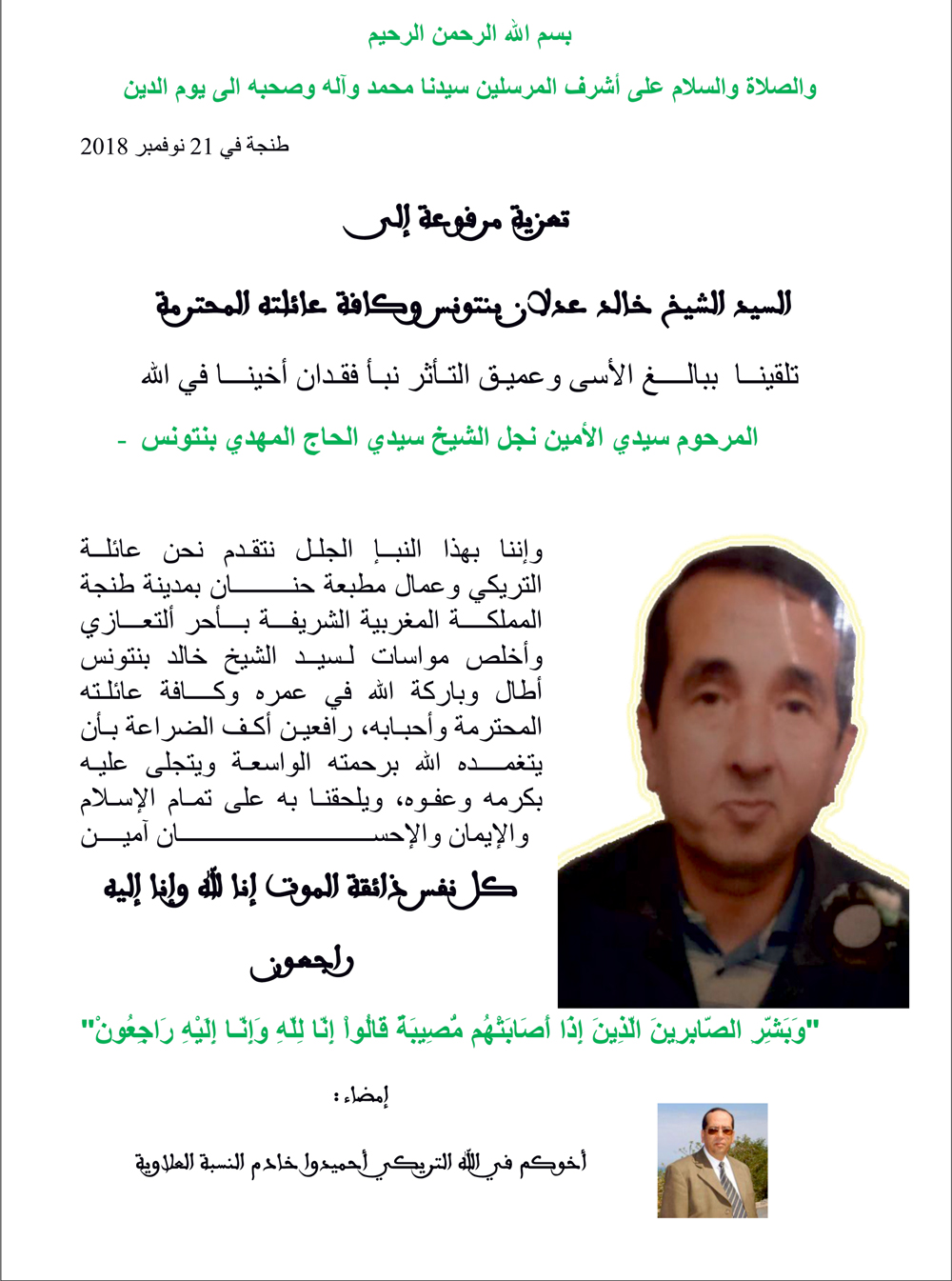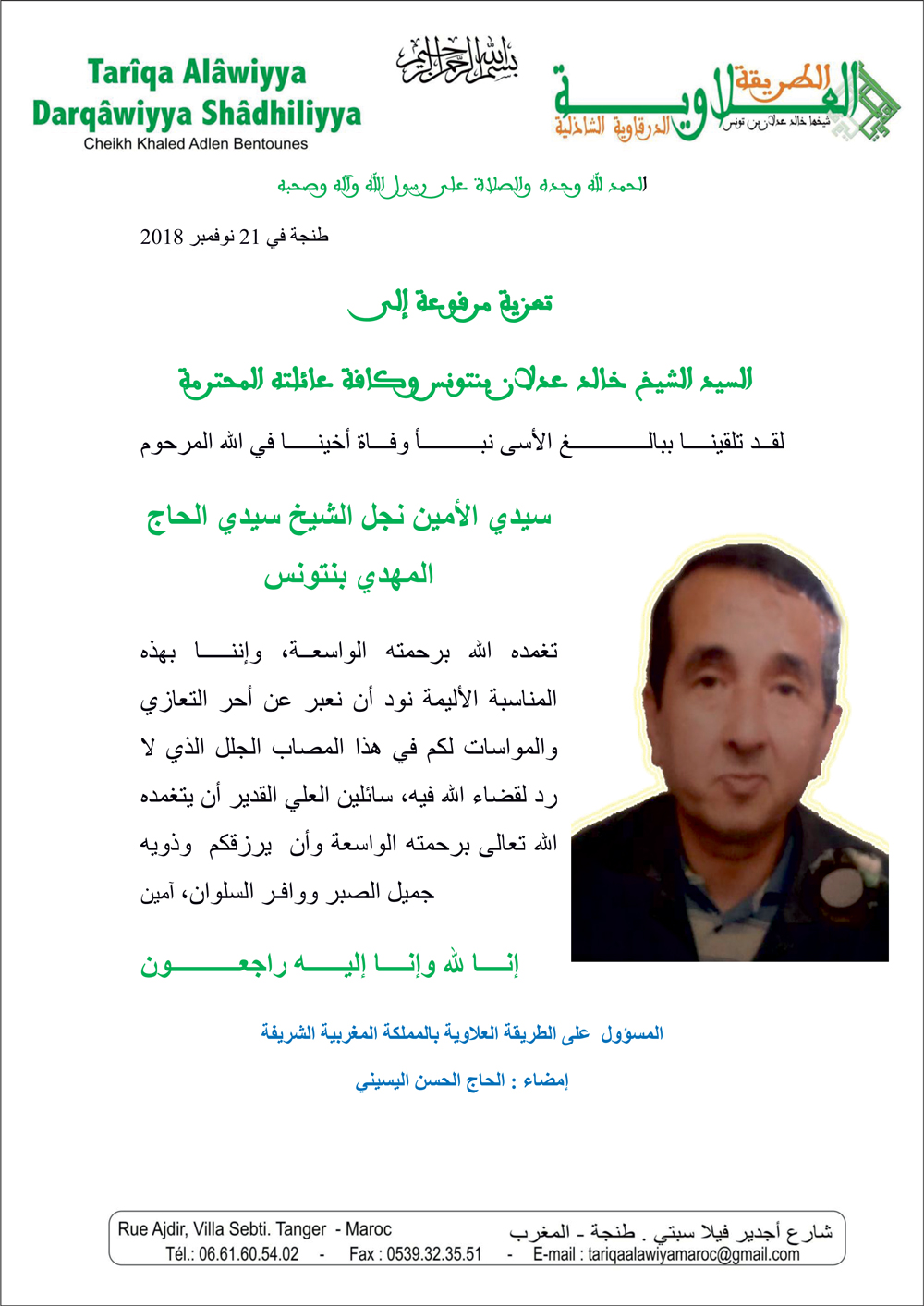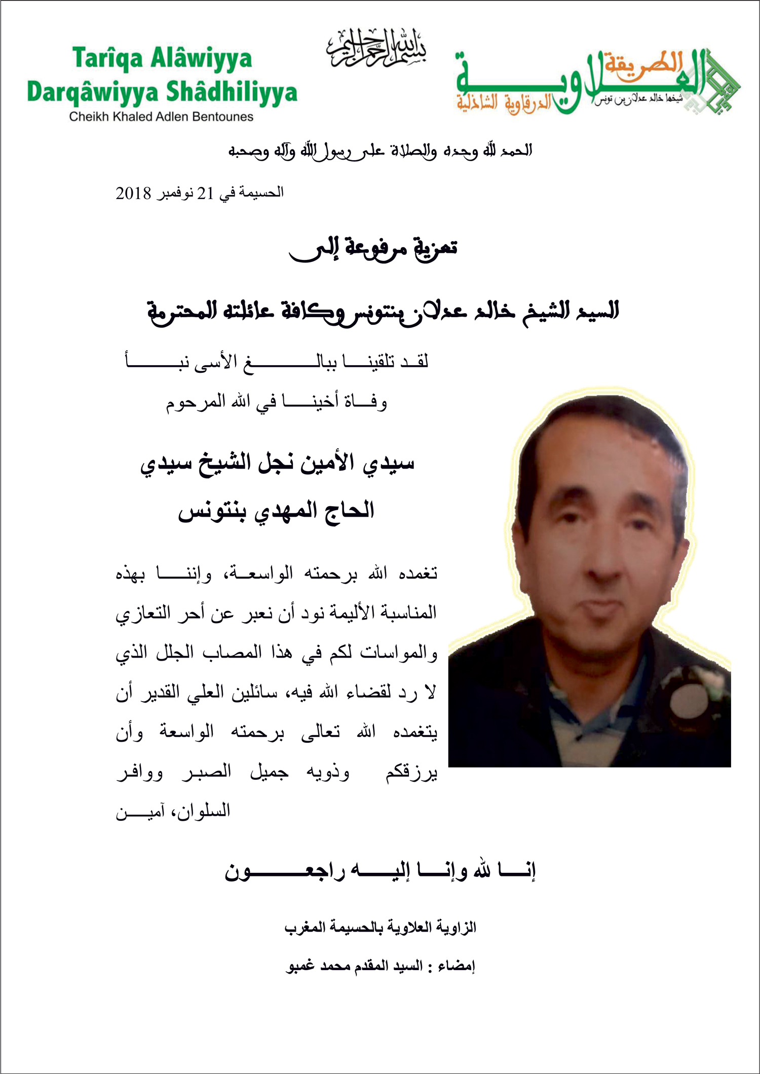 بسم الله الرحمن الرحيم — والصلاة والسلام على أشرف المرسلين سيدنا محمد وآله وصحبه الى يوم الدين — تعزيـــــــة مرفوعة إلى عائلة المرحوم سيدي أمين بن تونس ابن الشيخ سيدي الحاج المهدي بنتونس بمدينة مستغانم — تلقينا ببالغ الأسف وعميق التأثر نبأ فقدان أخينا في الله المنتقل إلى عفو الله و رحمته إننا بهذا النبــــإ الجلل نتقـدم فقراء وفقيرات مدريد بأحر تعـــازينــا وأخلص مواساتنا لعائلـة الفقيد وأحبابه، رافعين أكف الضراعة بأن يتغمده الله برحمته الواسعة ويتجلى عليــه بكرم عفوه — كل نفس ذائقة الموت إنا لله وإنا إليه راجعــــون — وَبَشِّرِ الصَّابِرِينَ الَّذِينَ إِذَا أَصَابَتْهُم مُّصِيبَةٌ قَالُواْ إِنَّا لِلّهِ وَإِنَّـا إِلَيْهِ رَاجِعُونْ“ — ونطلب الله ان يحفظ شيخنا واستاذنا الحالي الشيخ سيدي خالد بما حفظ به الذكر الحكيم ويمده بالصحة والعافية امين