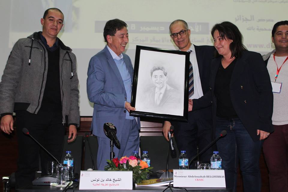 في ختام محاضرة “العيش معا في سلام”، اهدت الفنانة الروسية ماقدولينا ماقدولين الشيخ خالد عدلان بن تونس لوحة تذكارية تحمل صورة الشيخ