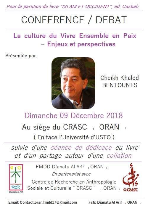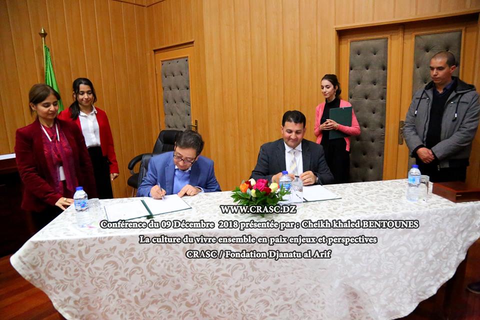 نظم مكتب وهران للمؤسسة المتوسطية للتنمية المستدامة – جنة العارف و بالتنسيق مع “مركز البحث في الأنثربولوجيا الاجتماعية والثقافية”، بمقر هذا الاخير، محاضرة تحت عنوان “العيش معا في سلام – تحديات و تطلعات” المحاضرة من تقديم الشيخ خالد عدلان بن تونس “الرئيس الشرفي ومؤسس المؤسسة المتوسطية للتنمية المستدامة – جنة العارف -، صاحب مشروع اليوم الدولي للعيش معا في سلام”، وبهذه المناسبة تم التوقيع على اتفاقية عمل ما بين مؤسسة جنة العارف ومركز البحث في الأنثربولوجيا الاجتماعية والثقافية.