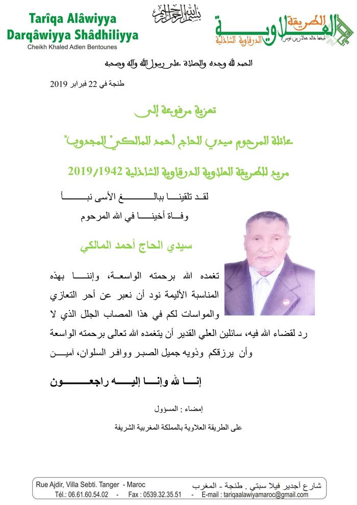 تلقينا ببالغ الأسف وعميق التأثر نبأ فقدان أخينا في الله المنتقل إلى عفو الله و رحمته ” سيدي الحاج أحمد المالكي “المجدوب” إننا بهذا النبــــإ الجلل نتقـدم نحن طـــاقم موقع الشيــــخ العلاوي بأحر تعـــازينــا وأخلص مواساتنا لشيخنا خالد عدلان بن تونس ولجميع فقراء وفقرات الطريقة العلاوية ولعائلـة الفقيد وأحبابه، رافعين أكف الضراعة بأن يتغمده الله برحمته الواسعة ويتجلى عليــه بكرم عفوه وحلمه، ويلحقنـــا به على تمام الإســــلام و الإيمــــان و الإحســـــان