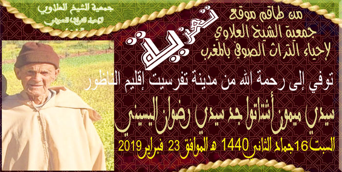 تلقينا ببالغ الأسف وعميق التأثر نبأ فقدان أخينا في الله المنتقل إلى عفو الله و رحمته ” سيدي ميمون أشتاتوا جد سيدي رضوان اليسيني“ إننا بهذا النبــــإ الجلل نتقـدم نحن طـــاقم موقع الشيــــخ العلاوي بأحر تعـــازينــا وأخلص مواساتنا لشيخنا خالد عدلان بن تونس ولجميع فقراء وفقرات الطريقة العلاوية ولعائلـة الفقيد وأحبابه، رافعين أكف الضراعة بأن يتغمده الله برحمته الواسعة ويتجلى عليــه بكرم عفوه وحلمه، ويلحقنـــا به على تمام الإســــلام و الإيمــــان و الإحســـــان