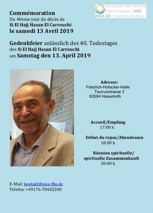 En direct de Francfort (Allemagne), la réunion spirituelle en hommage au Fakir notre frère Sidi Hassan El Carrouchi à l’occasion du 40e jour de son départ vers son Seigneur