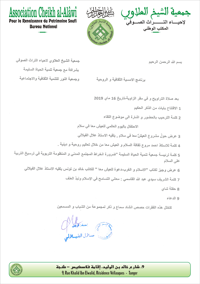 الزاوية “العلاوية” بالناظور تُحيي أمسية روحية لإشاعة ثقافة السلام والتحسيس بأهمية القيم الانسانية 16 ماي 2019